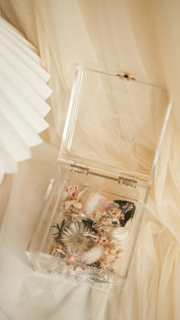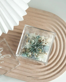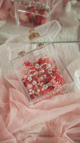 Kotak cincin full akrilik dihiasi rangkaian bunga dried & preserved asli.