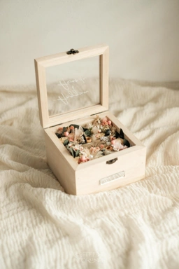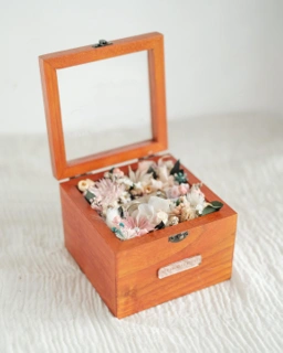 Kotak cincin kayu dihiasi rangkaian bunga dried & preserved asli.