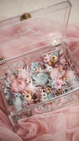 Kotak perhiasan full akrilik dihiasi rangkaian bunga dried & preserved asli. Dapat digunakan untuk seserahan, mahar, atau penyimpanan pribadi.